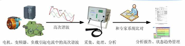 電氣設(shè)備有異常和劣化,就會(huì)有高次諧波發(fā)生。不同電氣設(shè)備,不同部位出現(xiàn)異常、劣化等情況時(shí),所產(chǎn)生的諧波種類 和含有率不同,利用諧波對(duì)設(shè)備運(yùn)行狀態(tài)進(jìn)行監(jiān)測(cè)是全新的技術(shù)。通過采用非接觸式傳感器,提取在運(yùn)轉(zhuǎn)的電氣設(shè)備 的電流各次諧波信號(hào),處理、分析,并與專家數(shù)據(jù)庫比對(duì),形成專家分析報(bào)告,進(jìn)行電機(jī)部及負(fù)載部的故障診斷。