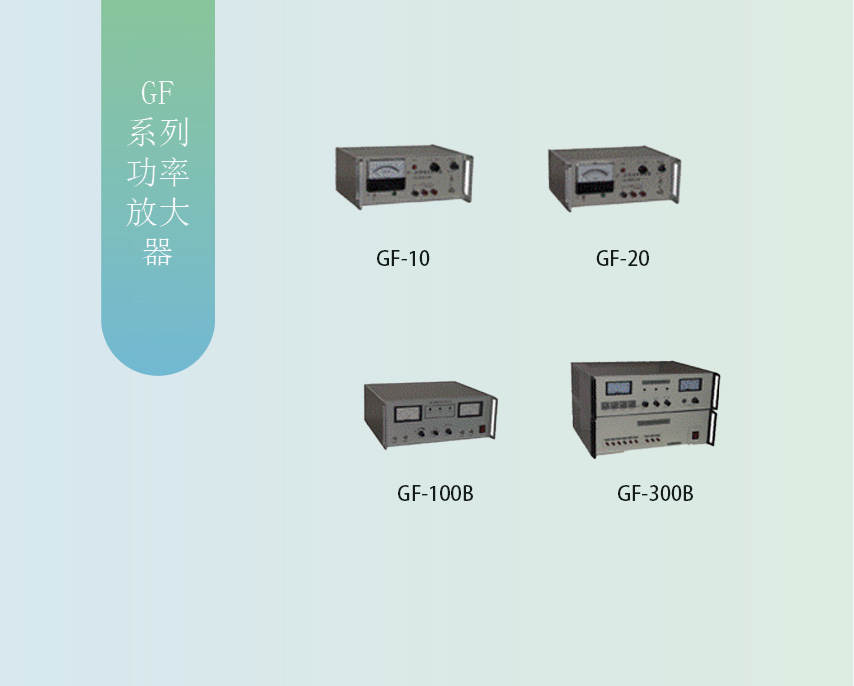 GF-20型功率放大器,用來推動小激振器,振動臺,揚聲器等負載。其可使用頻率從DC到100KHZ,輸出功率為10/20VA(10Ω/5Ω)。